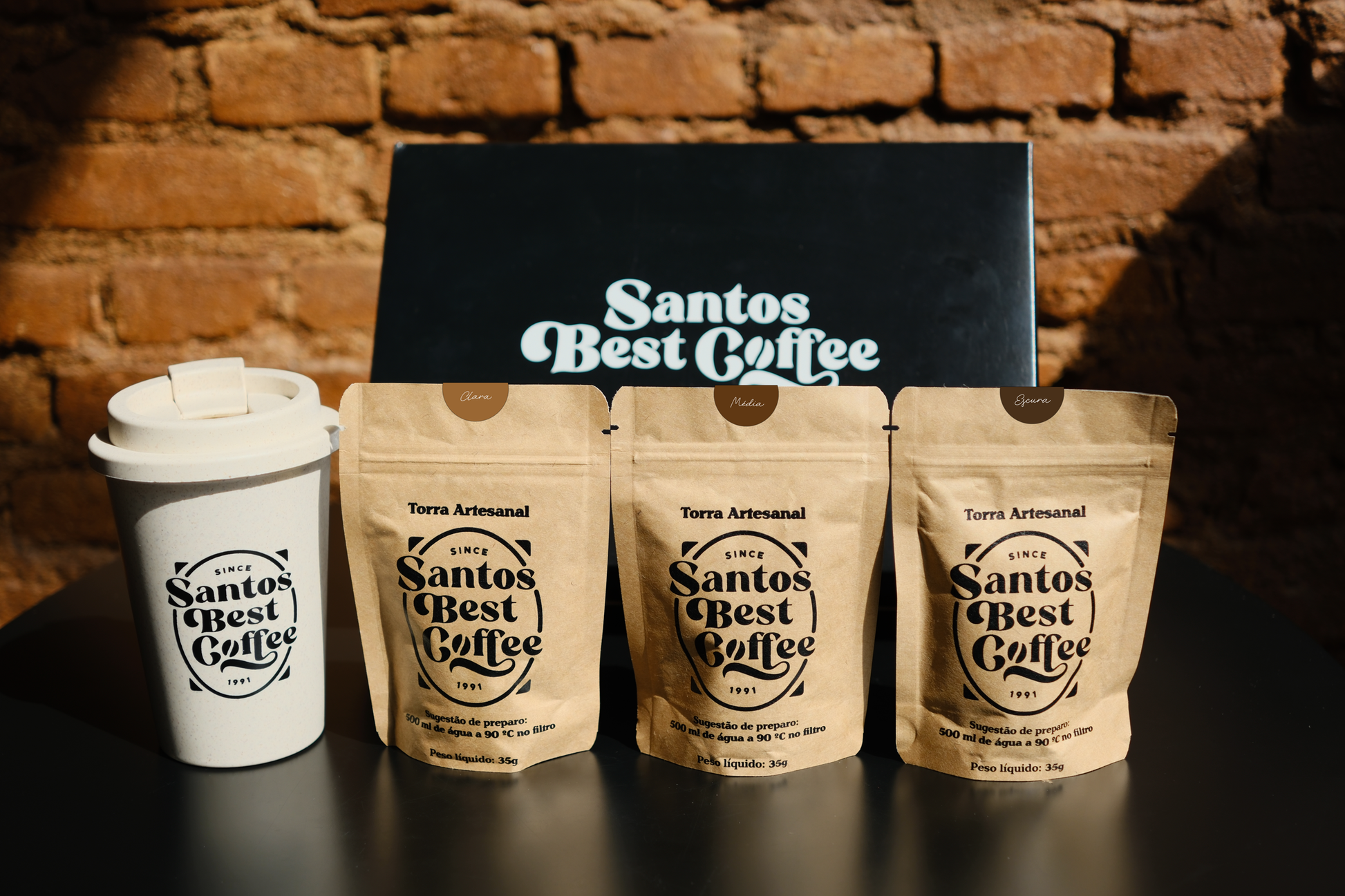 Kit de Degustação Santos Best Coffee com copo de fibra de bambu – Torras Clara, Média e Escura – em grãos (105g)
